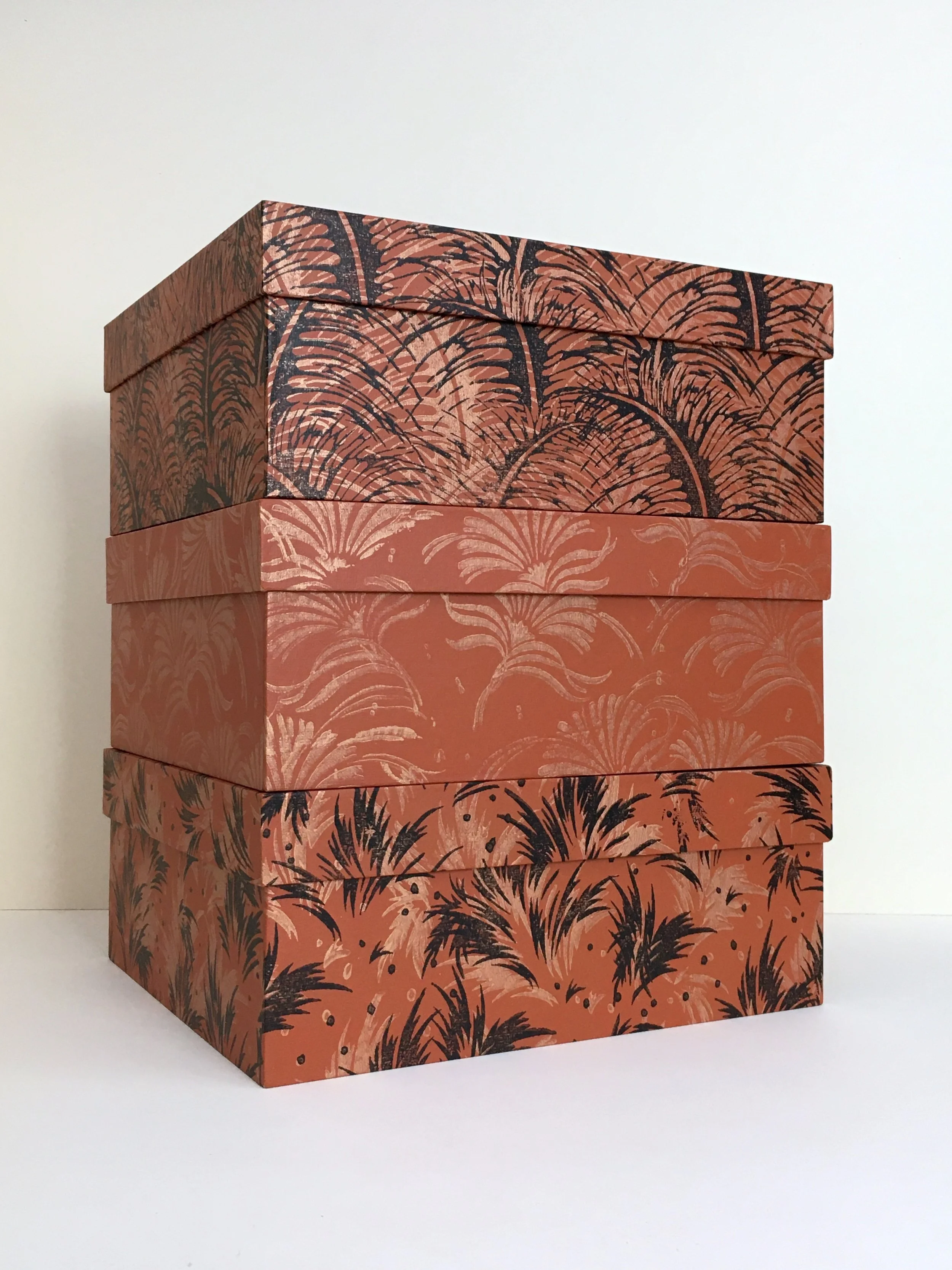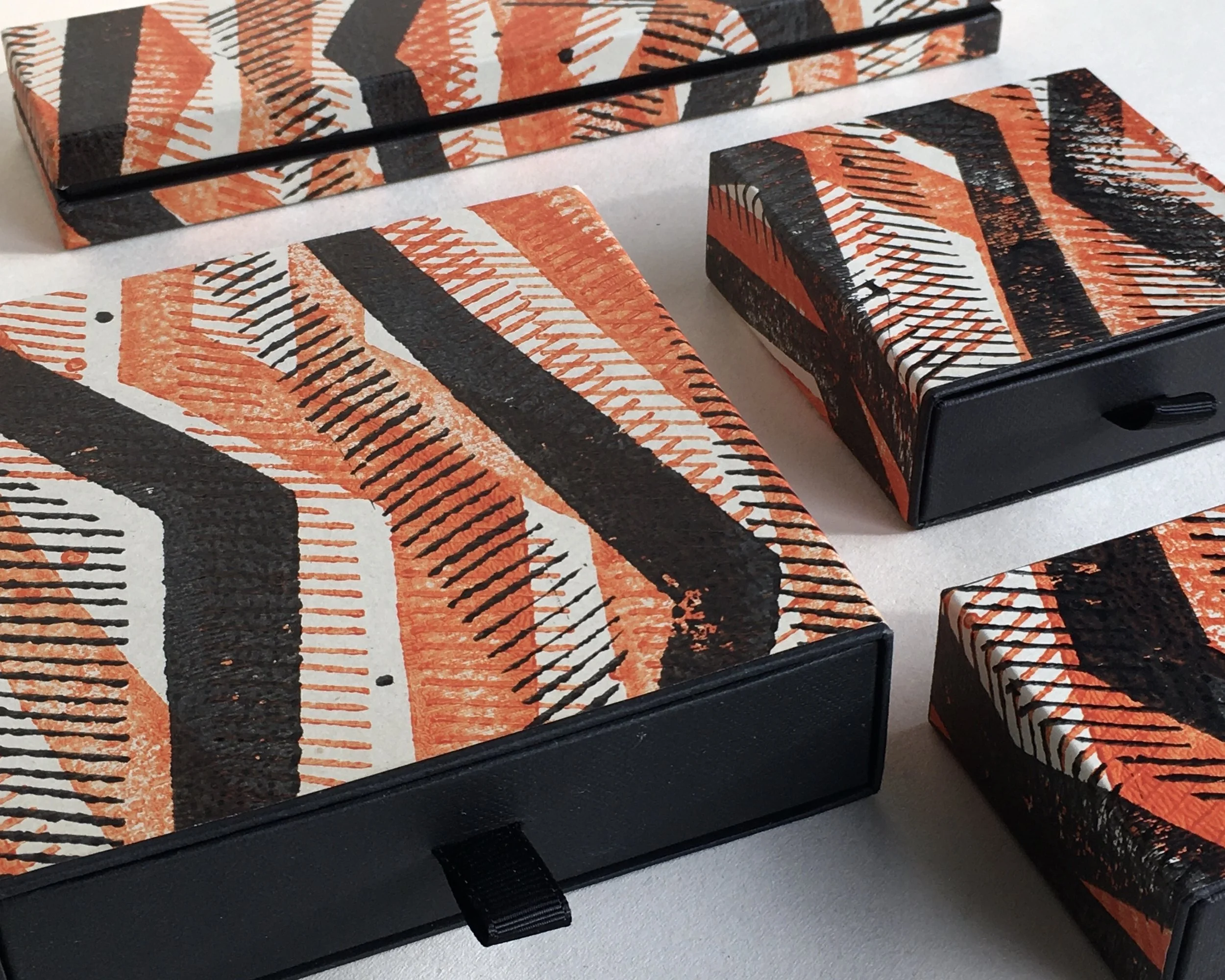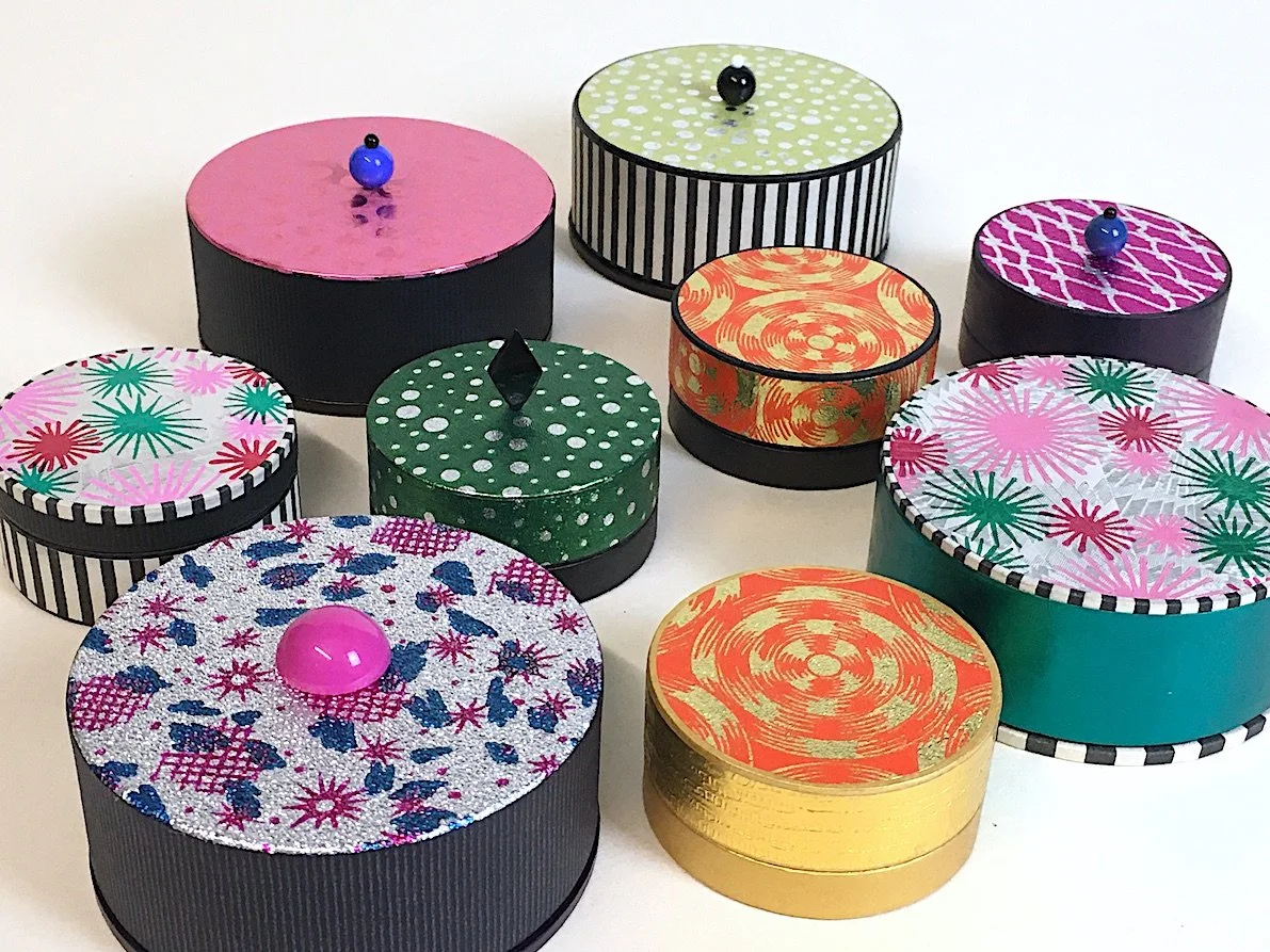 In dieser Serie werden vorgefertigte Stülpdeckelkartons mit meinen raffinierten, hangefertigten Buntpapieren bezogen.So entstehen schicke Schachteln zur Aufbewahrung oder auch wiederverwertbare Geschenkboxen in vier praktischen Formaten.