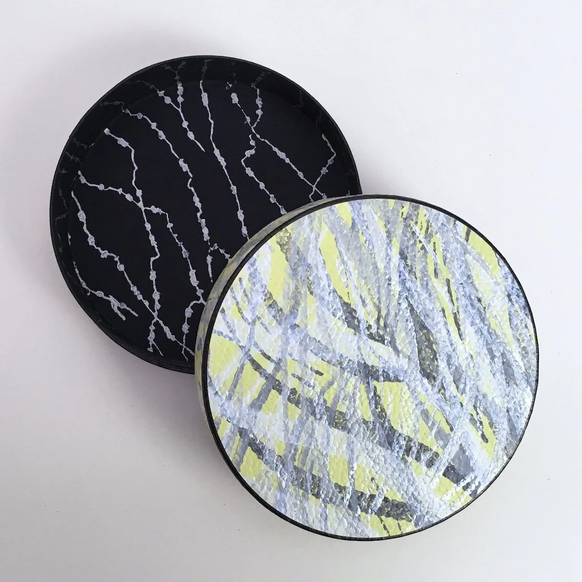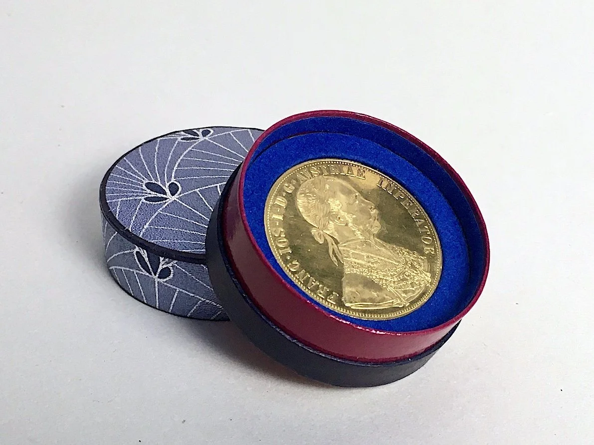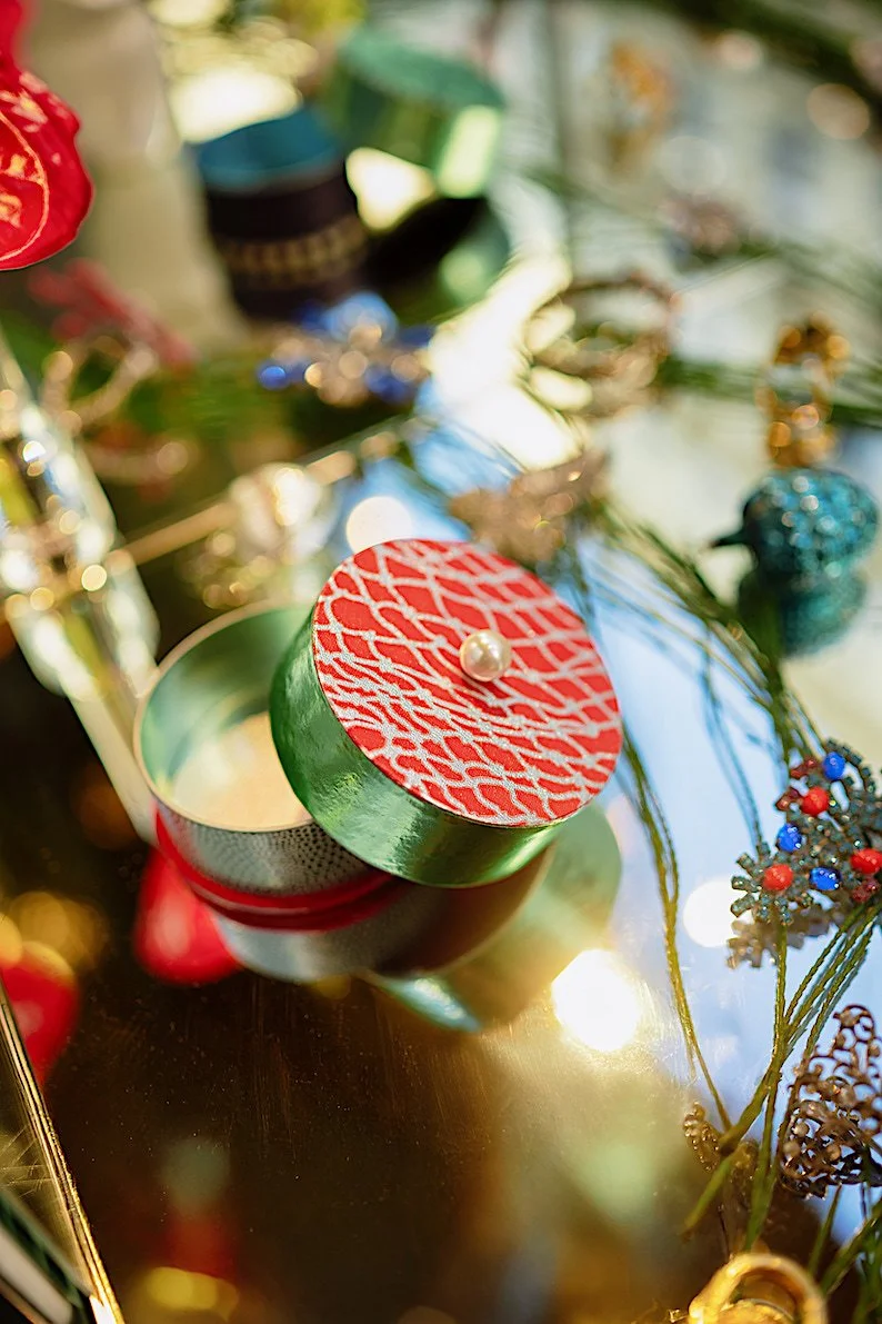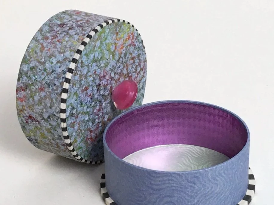 Diese feinen, runden Papier-Dosen entstehen in präziser Handarbeit – jede ist ein Unikat und eine Collage aus Karton, selbst bemusterten Papieren oder Vintage-Buntpapieren sowie geprägten und bedruckten Metallfolien aus historischer Produktion.Zusätzliche Akzente erhalten sie durch Kostbarkeiten aus meinem Vintage-Fundus aus Glas, Porzellan, Stein oder Bakelit – Materialien mit Geschichte in neuem Glanz.