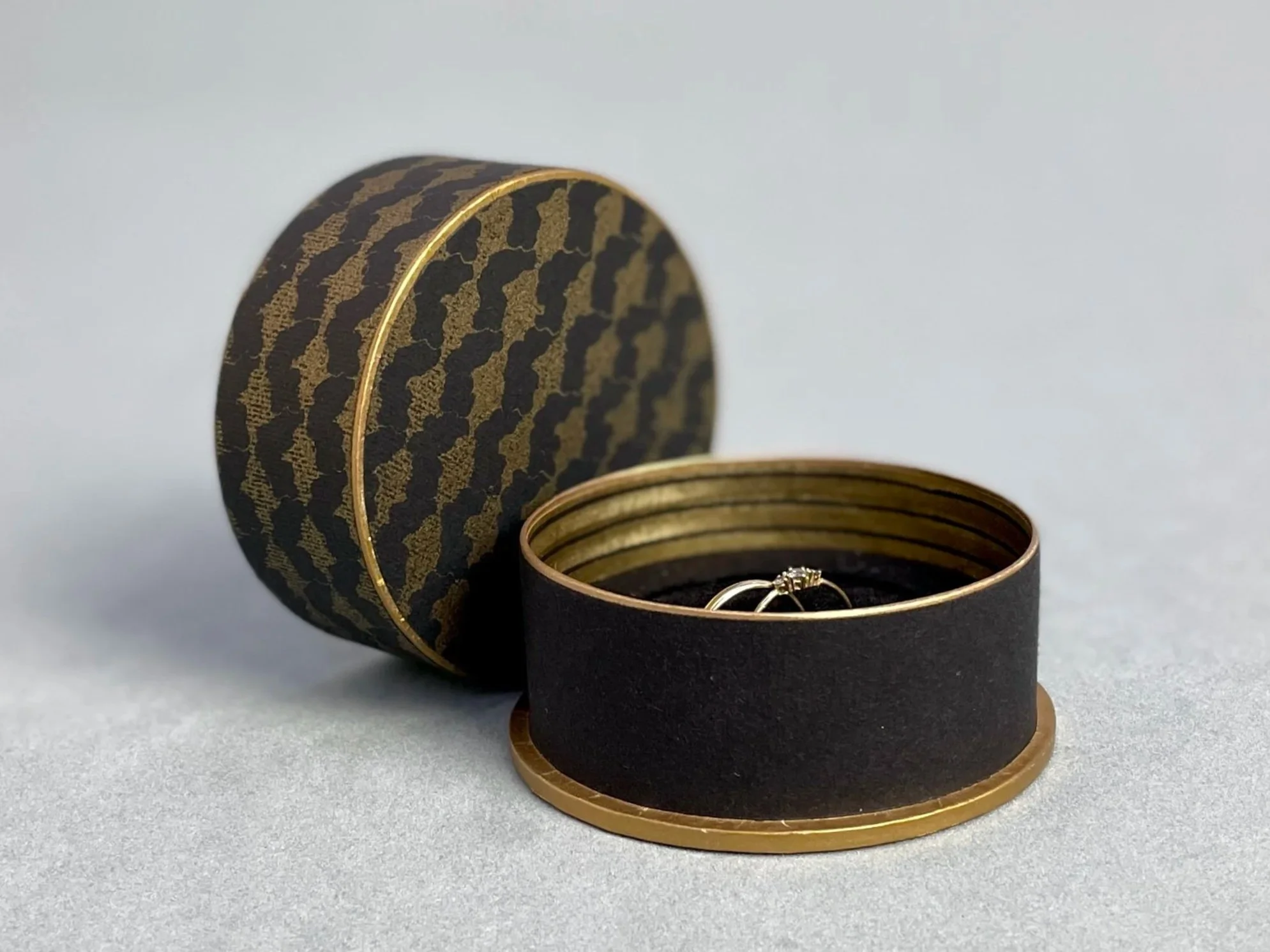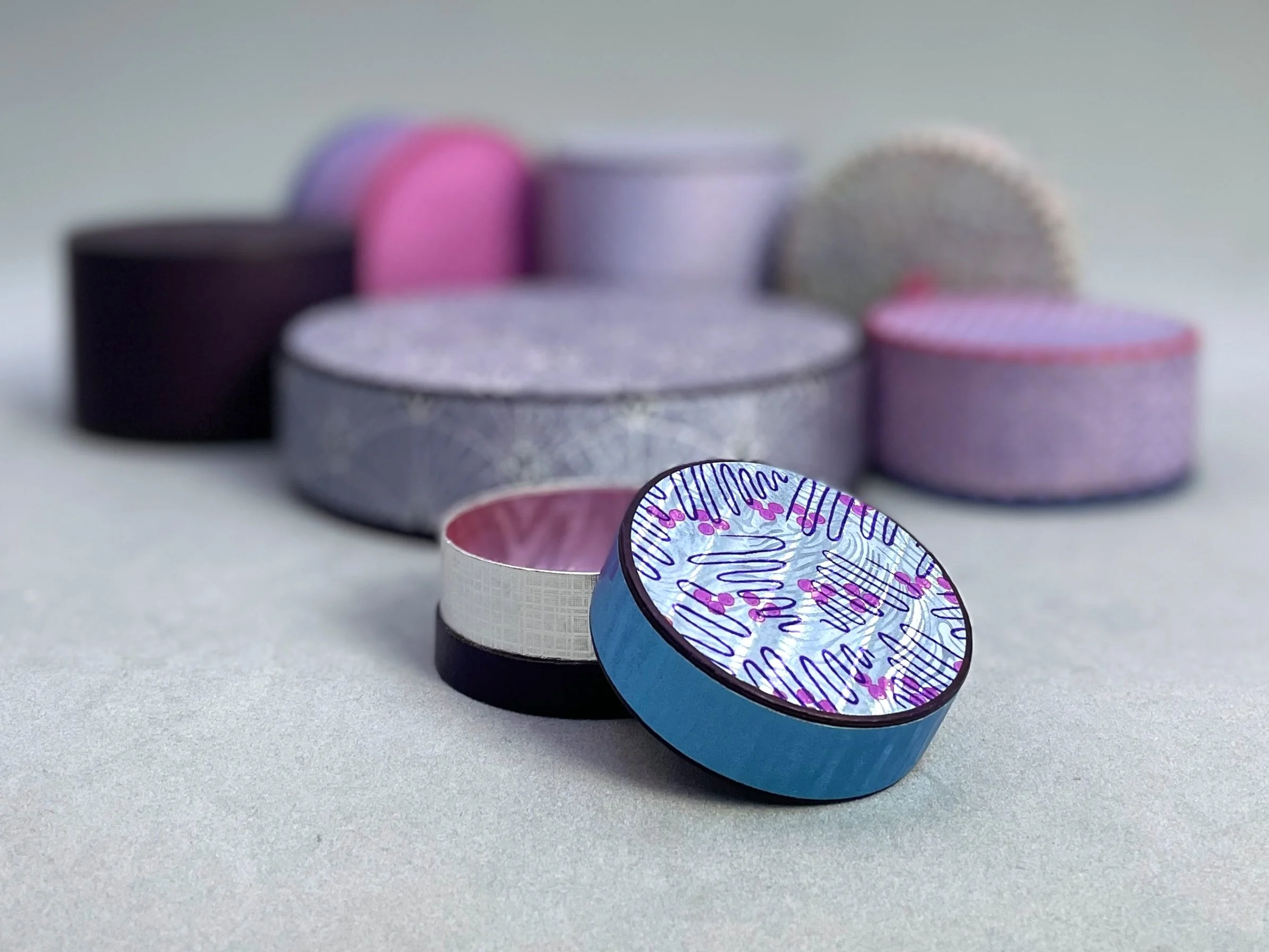 Diese feinen, runden Papierdöschen entstehen in präziser Handarbeit – jede ist ein Unikat und eine Collage aus Karton, selbst bemusterten Papieren oder Vintage-Buntpapieren sowie geprägten und bedruckten Metallfolien aus historischer Produktion.Zusätzliche Akzente erhalten sie durch Kostbarkeiten aus meinem Vintage-Fundus aus Glas, Porzellan, Stein oder Bakelit – Materialien mit Geschichte in neuem Glanz.